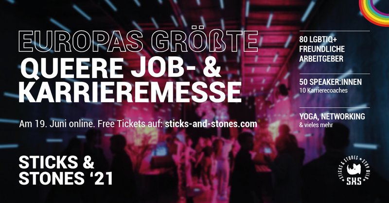 Am Samstag, 19. Juni 2021 findet die dritte digitale Edition der queeren Karrieremesse STICKS & STONES im Zeitraum von 11:30 Uhr bis 18:00 Uhr statt.