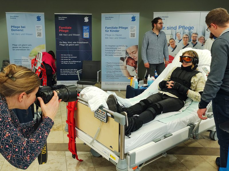 Neben den Besucher*innen schaute auch die Presse an unserem Stand vorbei: Sowohl die WAZ als auch Studio 47 haben unseren Altersanzug ausprobiert. Angeleitet wurden sie von Vitaly Volovyk, der alle Fragen detailliert beantwortete. In der WAZ ist bereits ein ausführlicher Artikel erschienen. Den Nachbericht zur Messe von Studio 47 finden Sie hier.