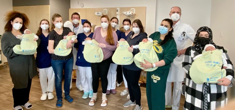 Ein ganz besonderes Datum hatten sich Diana, Maxim, Haroun, Hanca, Alya und Eleni ausgesucht, um das Licht der Welt zu erblicken. Das Team der Geburtshilfe unter der Leitung von Chefarzt Prof. Dr. Markus Schmidt freute sich gemeinsam mit den Eltern über die sechs Babys, die am 22.2.22 in den Sana Kliniken Duisburg geboren wurden und deren Geburtstag auch in Zukunft ein besonderer bleiben wird.