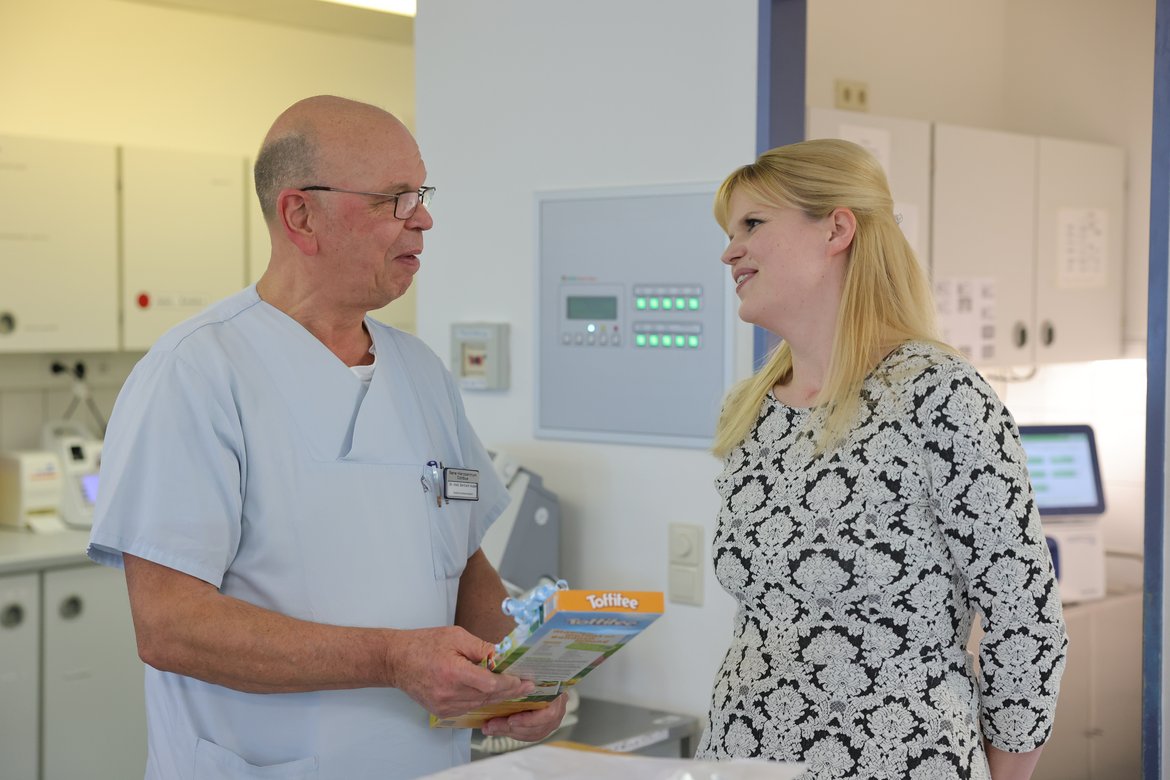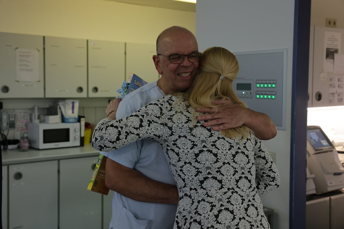Freudestrahlend umarmt Anne Lehmann Dr. Bertram Huber und sein Team. Sie hat schokoladige Nervennahrung und einmal mehr ein Dankeschön mit auf die Intensivstation (ITS) gebracht – und wird mit großer Wärme und Freude empfangen. An ihren Aufenthalt im Herzzentrum können sich alle noch sehr gut erinnern, denn das Schicksal der Lausitzerin hat hier jeden tief berührt.
