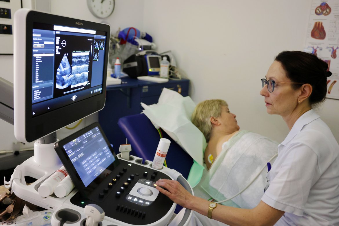 Ein Blick aufs Herz: Dr. Kristin Rochor, Leitende Oberärztin der Kardiologie am Sana-Herzzentrum Cottbus untersucht den Zustand des geschwächten Herzens der Patientin unter Ultraschall-Sicht. Regelmäßig wird diese Untersuchung wiederholt, um Veränderungen der Herzleistung frühzeitig zu erkennen.