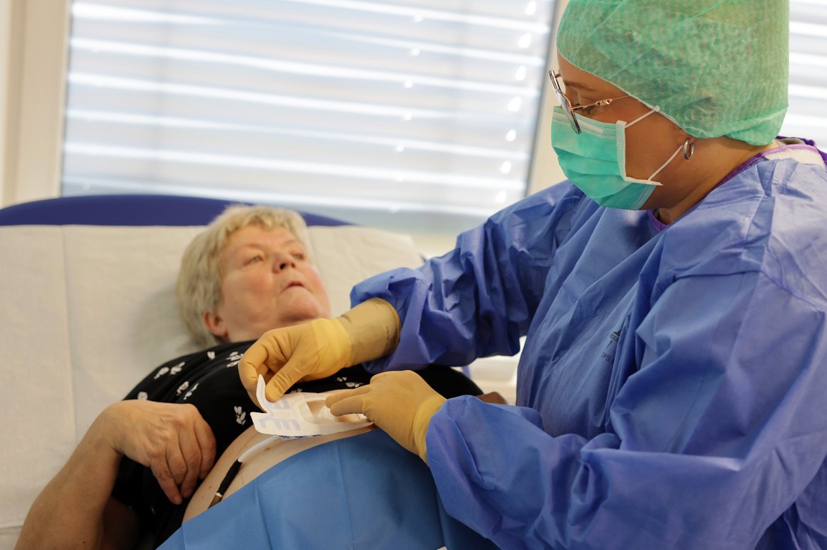 Wundschwester Katja Rähder versorgt die OP-Stelle mit einem sterilen Wundverband. Über diesen kleinen Schlauch wird das Blut von der Herzkammer in die Pumpe und anschließend wieder in den Körperkreislauf geführt.