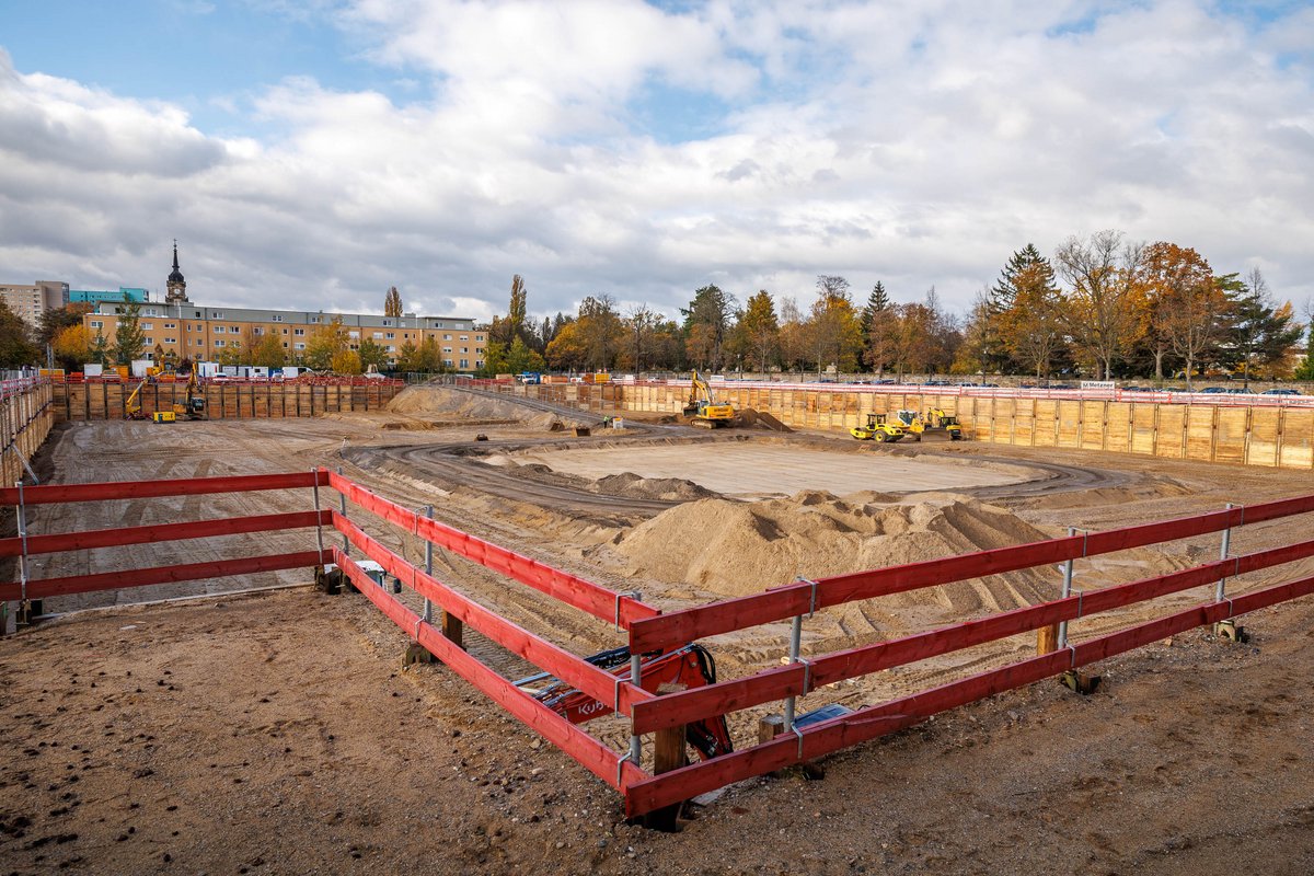 Auf dem künftigen Klinikgelände an der Ecke Blasewitzer Straße / Fetscherstraße sind die vorbereitenden Erdarbeiten abgeschlossen – ein entscheidender Schritt auf dem Weg zu einem der modernsten universitären Herzzentren Europas. Insgesamt wurden rund 60.000 Kubikmeter Erde bewegt und umfangreiche Sicherungsmaßnahmen umgesetzt, um die Grundlage für den weiteren Baufortschritt zu schaffen.
