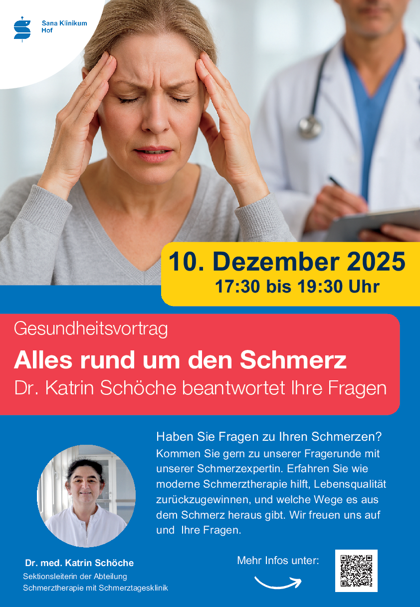 Das Angebot der Schmerztagesklinik am Sana Klinikum Hof richtet sich an Menschen mit chronischen Schmerzen. Angeboten werden zwei Therapieprogramme. Das teilstationäre Fünf-Wochen-Programm setze auf körperliche Aktivität, Physio-, Ergo- Psycho-, und Ernährungstherapie bis hin zu Akupunktur. Zur Krankheits- und Schmerzbewältigung durchlaufen Gruppen mit bis zu acht Schmerzpatienten ein mehrwöchiges Programm. Die Behandlung erfolgt wochentags von 8:00 bis 15:30 Uhr. Außerhalb dieser Zeit übt der Patient, das Erlernte in seinen Alltag zu integrieren und zu Hause umzusetzen. Für ältere Menschen und Patienten, die das normale Programm überfordern würde, gibt es im Sana Klinikum Hof ein spezielles Seniorenprogramm. Das Ziel ist es, Schmerzbewältigungsstrategien zu entwickeln und damit eine bessere Mobilität und Lebensqualität trotz chronischer Schmerzen zu erreichen. Das Seniorenprogramm läuft über 12 Wochen, hier kann man mit den parallel laufenden Programmen langfristig deutliche Linderung verschaffen. Interessenten können unter Telefon 09281 98-3765 gern zu einem Erstgespräch anmelden. Gern steht das Team der Schmerztagesklinik für persönlichen Fragen zur Verfügung.