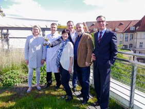 Der Geschäftsführerin Margarete Janson oblag es dann, die Zeitkapsel auf den Weg nach Stuttgart zu schicken. Bei sonnigem Frühlingswetter wurde er von der Klinikleitung um Regionalgeschäftsführer Dr. Ingo Hüttner und PD Dr. Michael W. Müller, dem ärztlichen Direktor des Karl-Olga-Krankenhauses, stellvertretend für alle Standorte der Sana Kliniken in der Landeshauptstadt in Empfang genommen.
