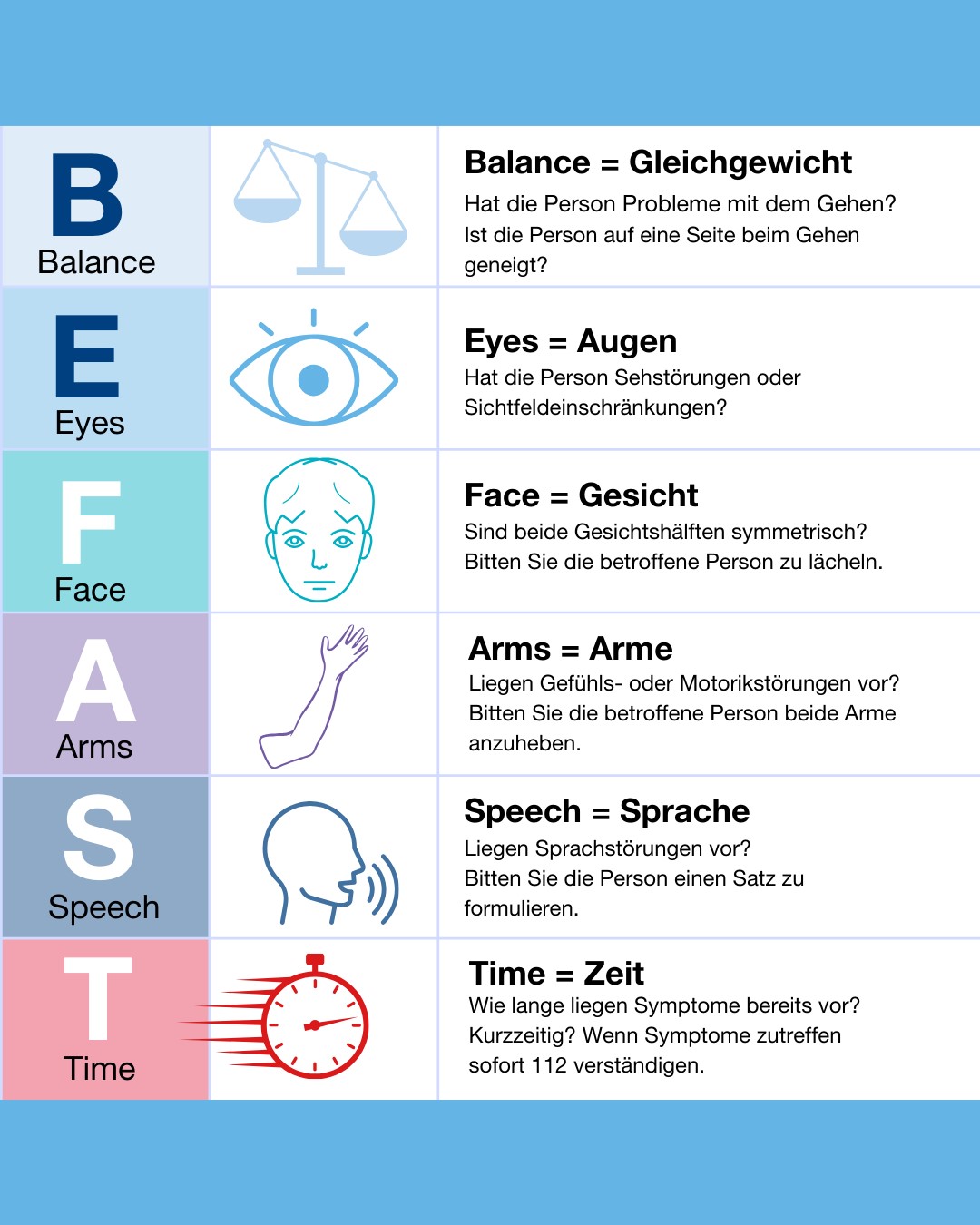 - TIME (Zeit): Stellen Sie eines oder mehrere der genannten Symptome fest, wählen Sie umgehend die Notrufnummer 112 und schildern Sie Ihre Beobachtungen.