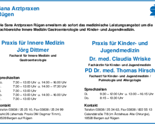 Jörg Dittmer, Facharzt für Innere Medizin und Gastroenterologie verstärkt seit 1. Januar 2019 das Team der Sana Arztpraxen Rügen. Am Standort der…