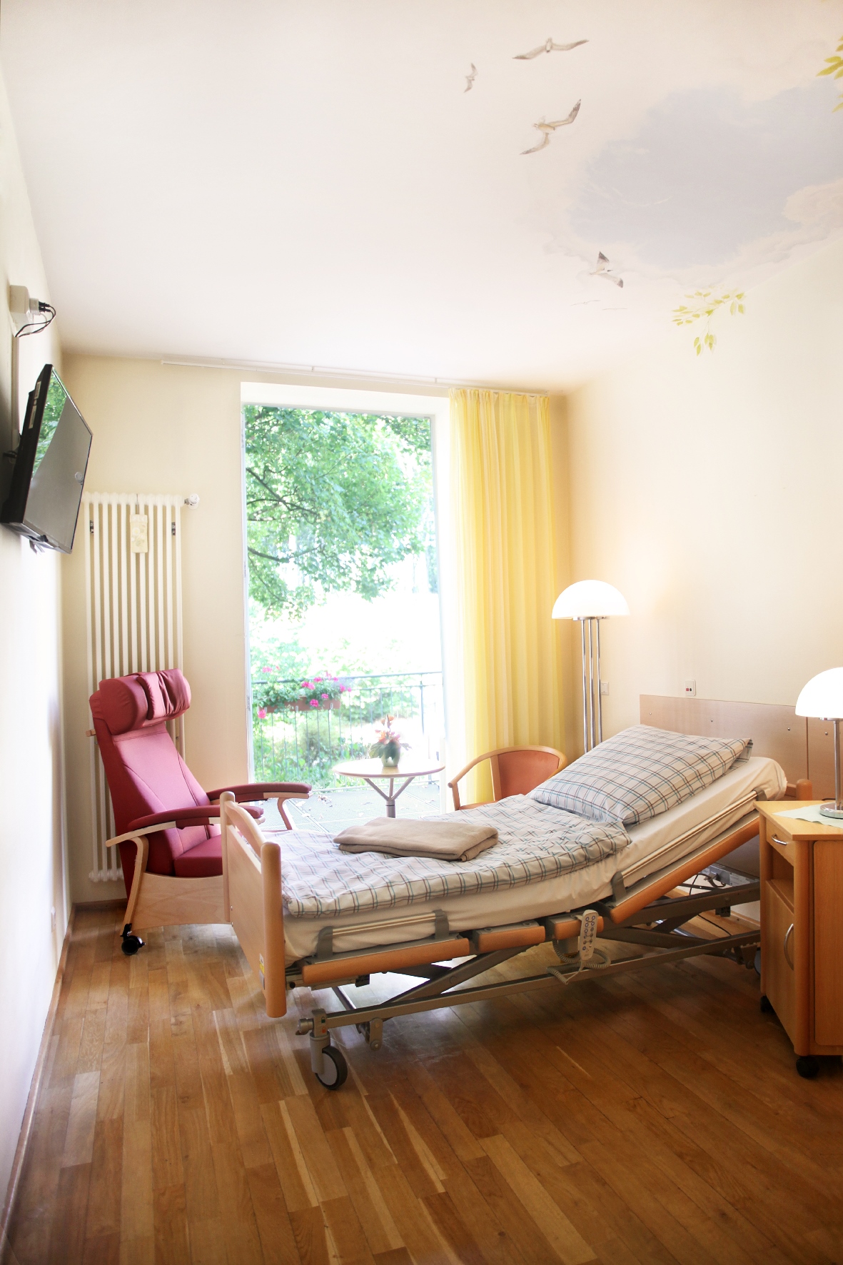 Das Hospiz verfügt über sechs wohnlich eingerichtete Einzelzimmer, teilweise mit Zugang zur Terrasse. Gern können kleinere Möbelstücke und/oder Bilder mitgebracht werden. Selbstverständlich ist, dass Angehörige und Freunde mit im Zimmer übernachten können. Es gibt auch ein separates Gästezimmer.