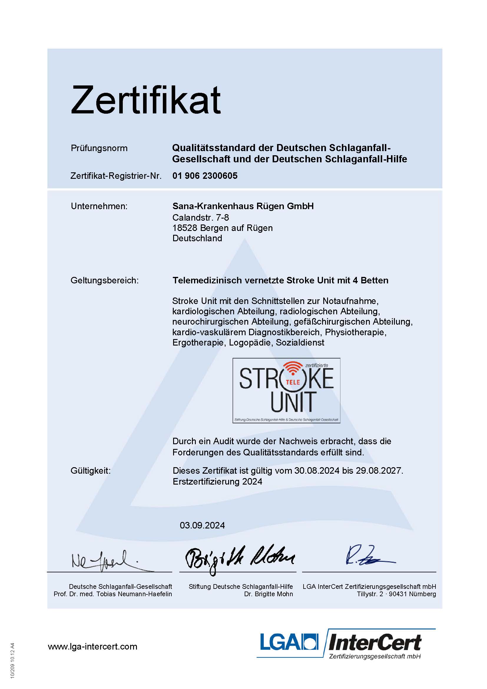 Im Sana-Krankenhaus Rügen steht zur Versorgung von Schlaganfallpatienten rund-um-die Uhr eine zertifizierte TeleStroke Unit, mit einer entsprechenden medizin-technischen und personellen Ausstattung, zur Verfügung. Hier werden betroffene Patienten ohne Zeitverzug aufgenommen und behandelt. Durch die Anbindung an das Telemedizinische Netzwerk ANNOTeM - Akutneurologische Versorgung in Nordostdeutschland mit telemedizinischer Unterstützung - kann zu jeder Zeit auf die neurologische Fachexpertise aus den angeschlossenen neurologischer Zentren der Universitätsmedizin Greifswald, des Unfallkrankenhauses Berlin und der Charité Universitätsmedizin Berlin zugegriffen werden und der akute Behandlungsablauf vor Ort koordiniert oder bei Notwendigkeit die Verlegung in die nächstmögliche überregionale StrokeUnit veranlasst werden.